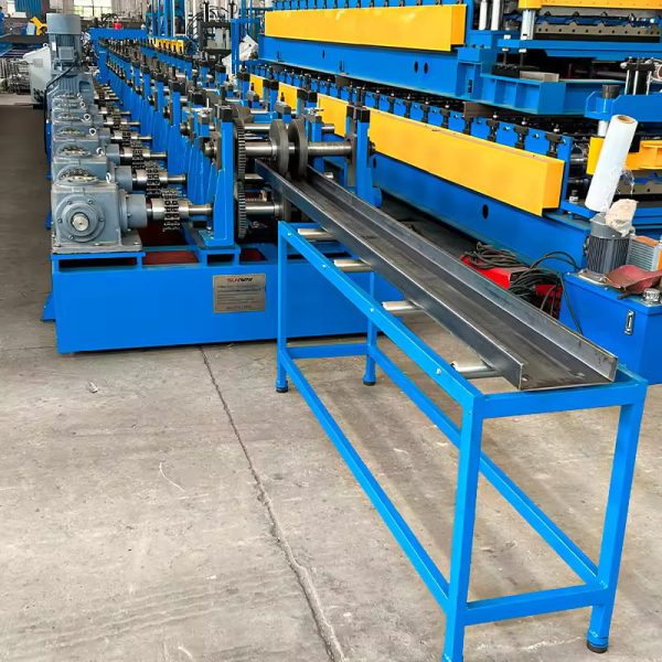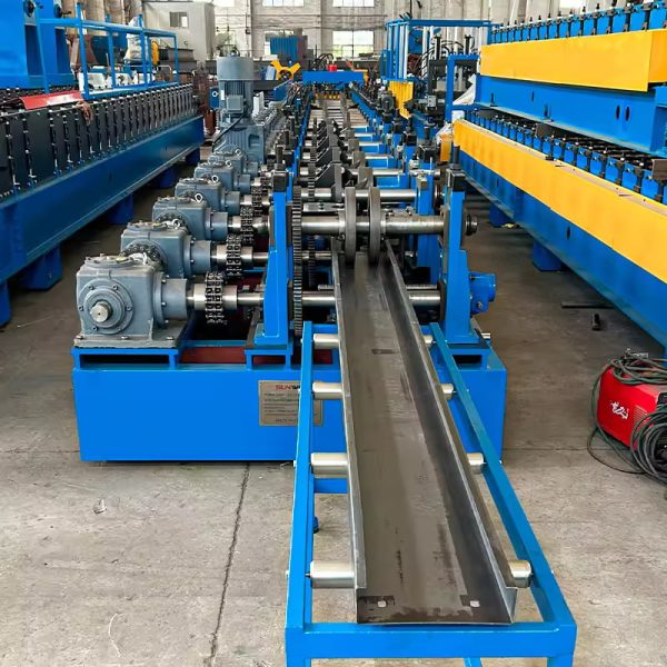 SUNWAY design this CZ purlin quick changeable roll forming machine to work with any size of the purlin, automatically adjustable sizes on PLC. Whats’ more, changing time from C to Z only need 5-10 minutes. Regarding the punching unit, we can design pre punching, post punching according to your requirement. For cutting unit, you can choose the pre-cut or post-cut which is universal cutting. The driving system we adopt the chain and mostly with gimbal /gearbox for transmission if the raw material is thicker than 2.5mm, this is much more strong driving power and more stable when forming the purlins.