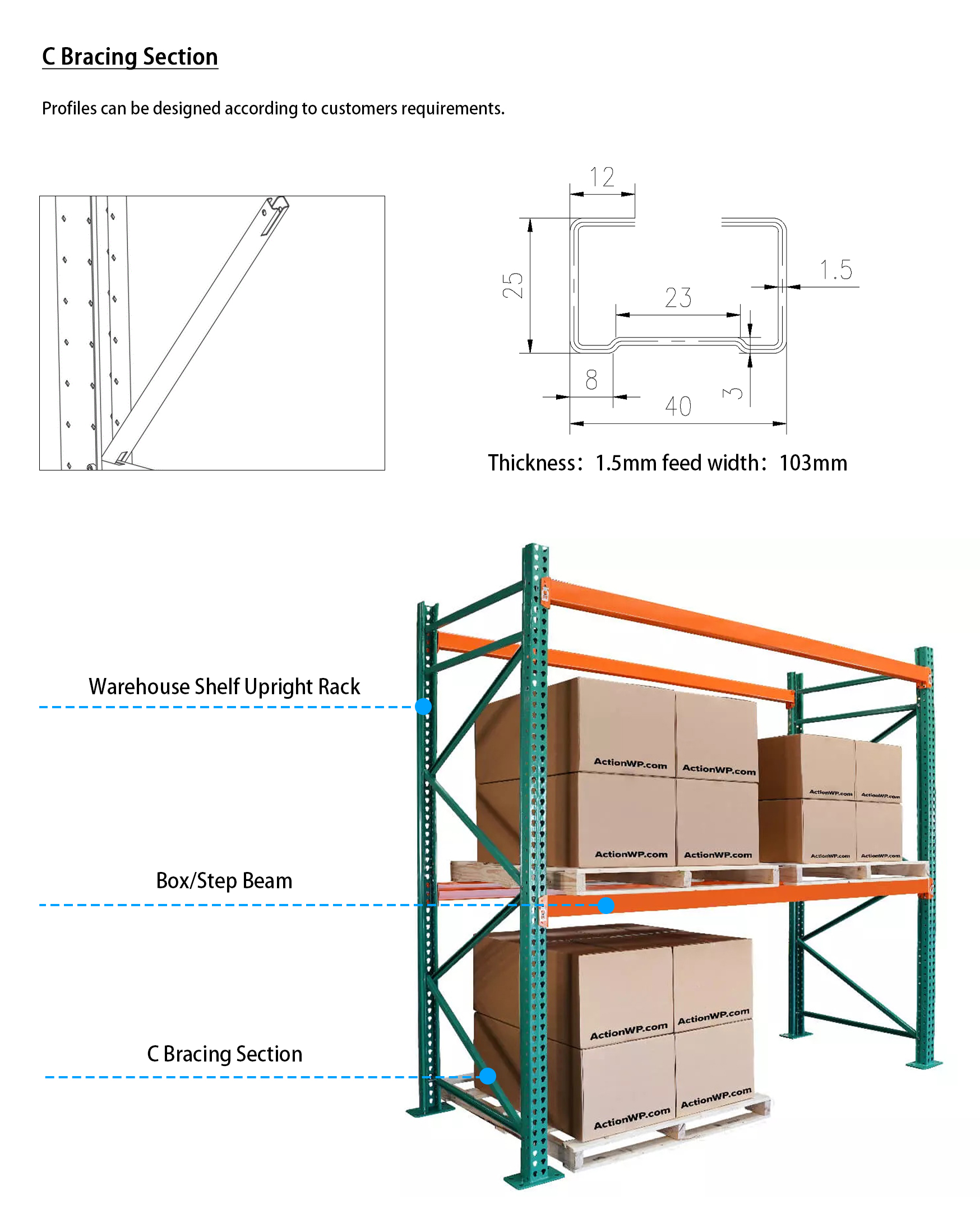 C beam according to the rack system requirements and thickness normally 1.5-1.8mm.